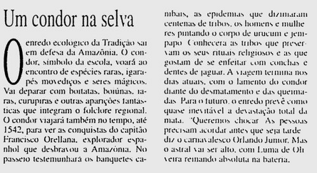 O G.R.E.S. TRADIÇÃO, preocupado com o grande número de desmatamentos existentes em diversos pontos e locais do país. que ocasionam a destruição das grandes florestas, vem contar estórias e lendas da maior floresta Equatorial do mundo.